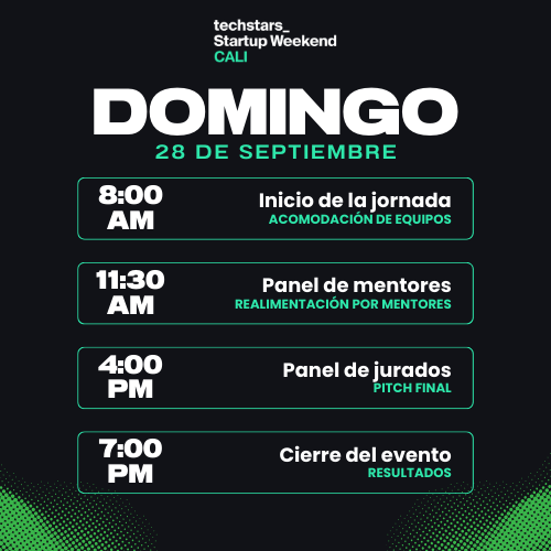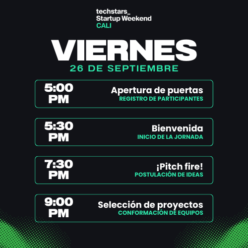 En Techstars Startup Weekend Cali, vivirás 54 horas de innovación, formarás equipo, aprenderás de mentores expertos y transformarás ideas en soluciones reales. No necesitas experiencia previa, sólo ganas de emprender y hacer historia.